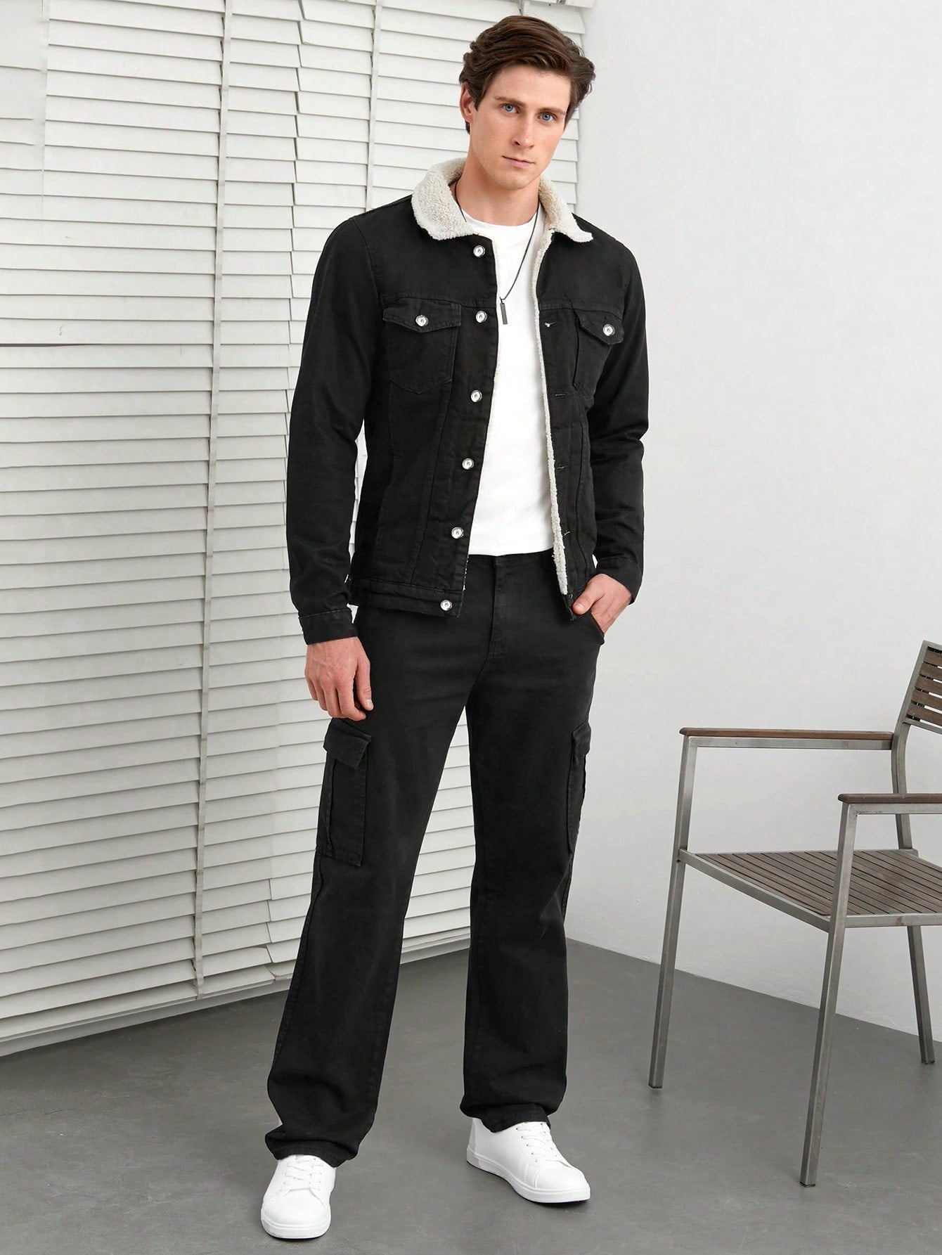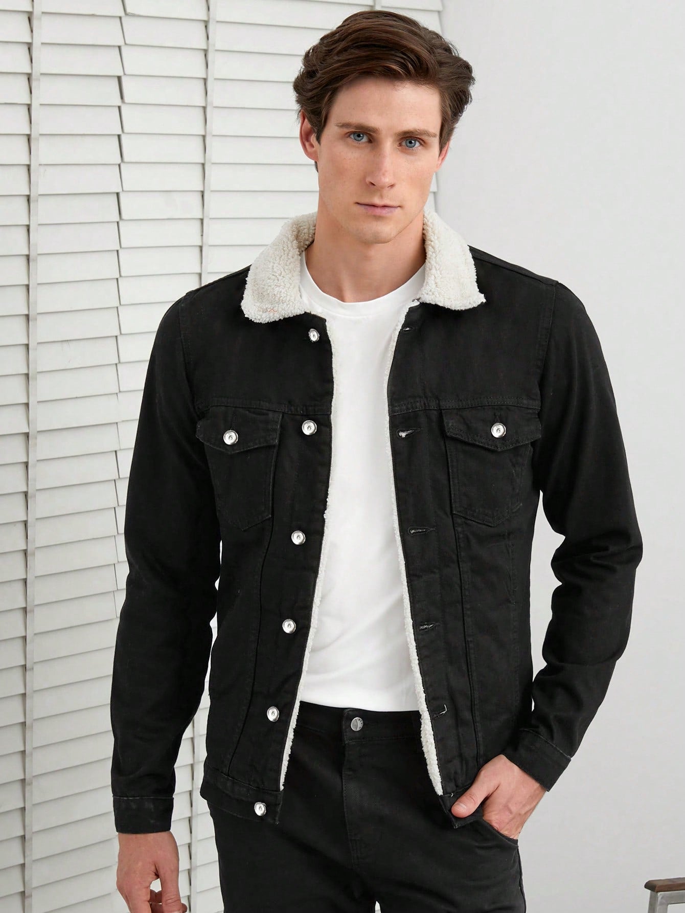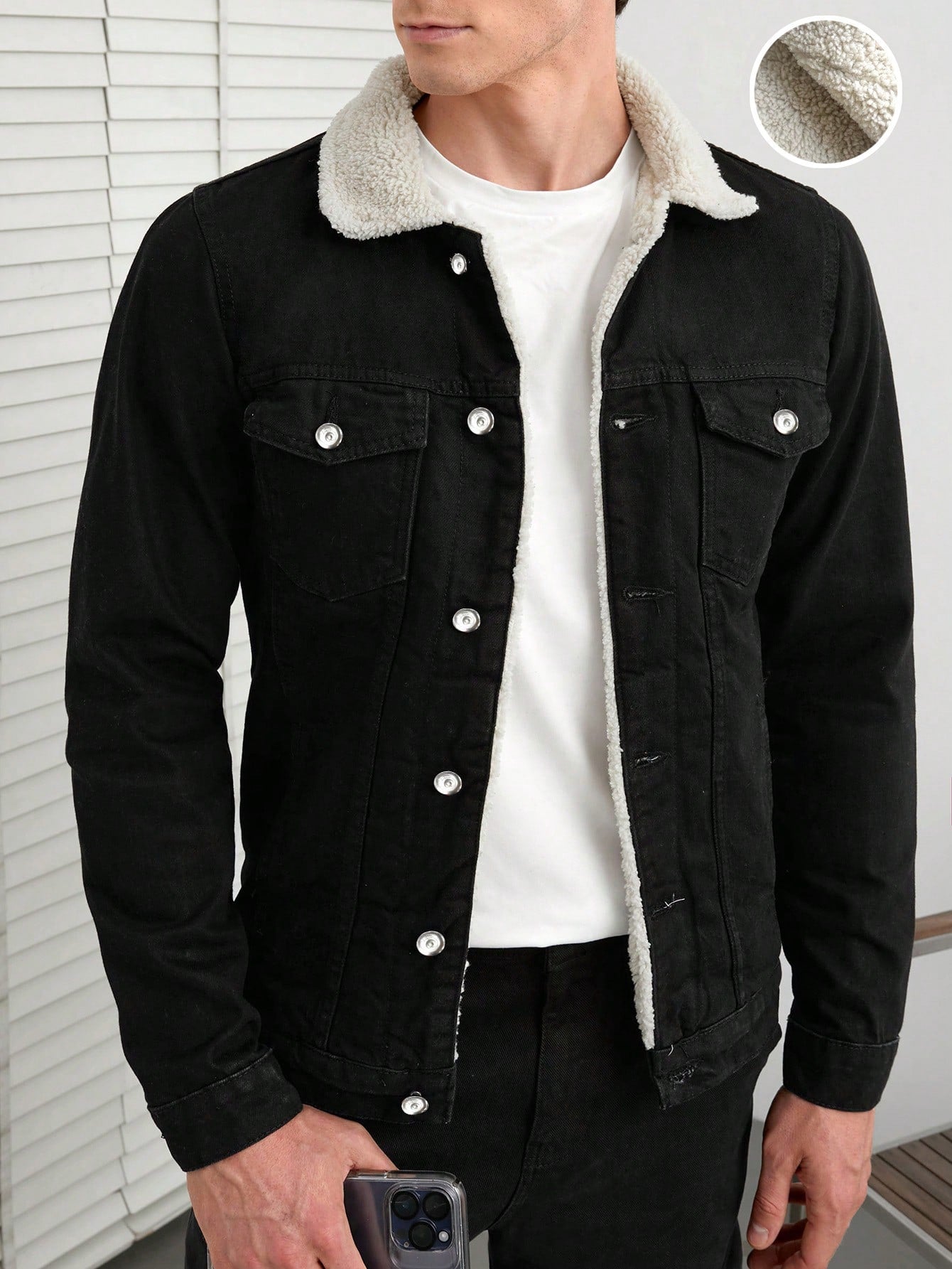 This stylish black denim jacket with a sherpa-lined collar is a timeless wardrobe essential, blending comfort and rugged charm for a versatile look. Its sleek fit and warm lining make it an ideal choice for cooler days.