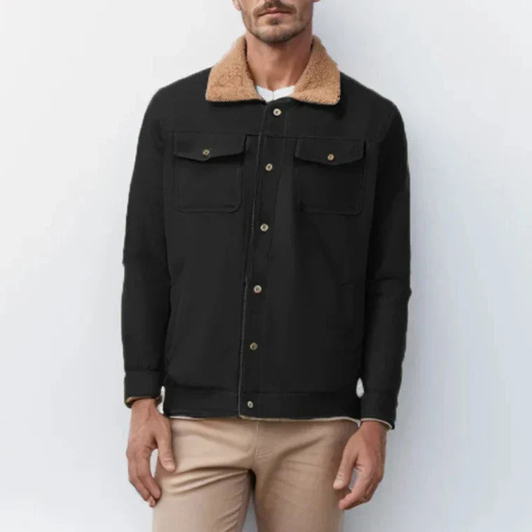 This men’s sherpa-lined jacket combines warmth and sophistication, making it a standout piece for cooler weather. With a durable black outer layer and a cozy sherpa collar, this jacket seamlessly blends practicality with a modern aesthetic.