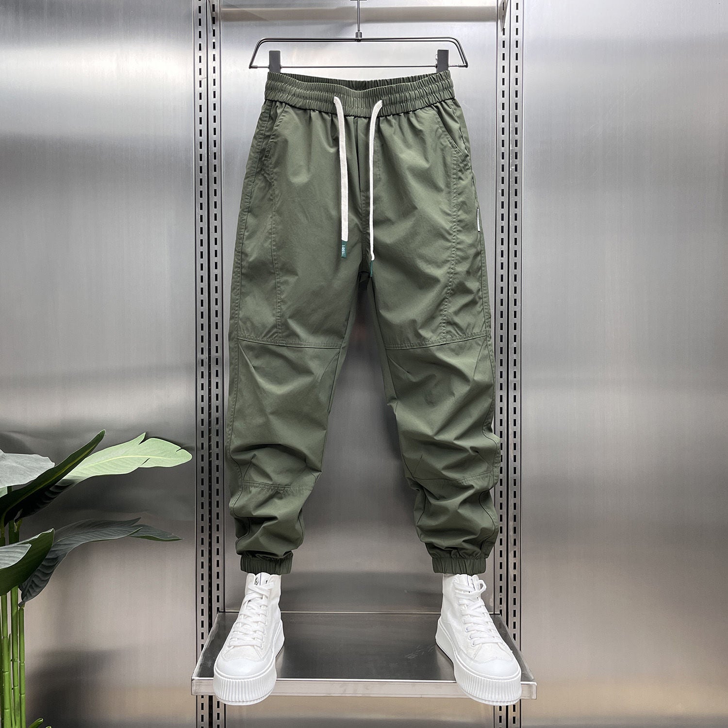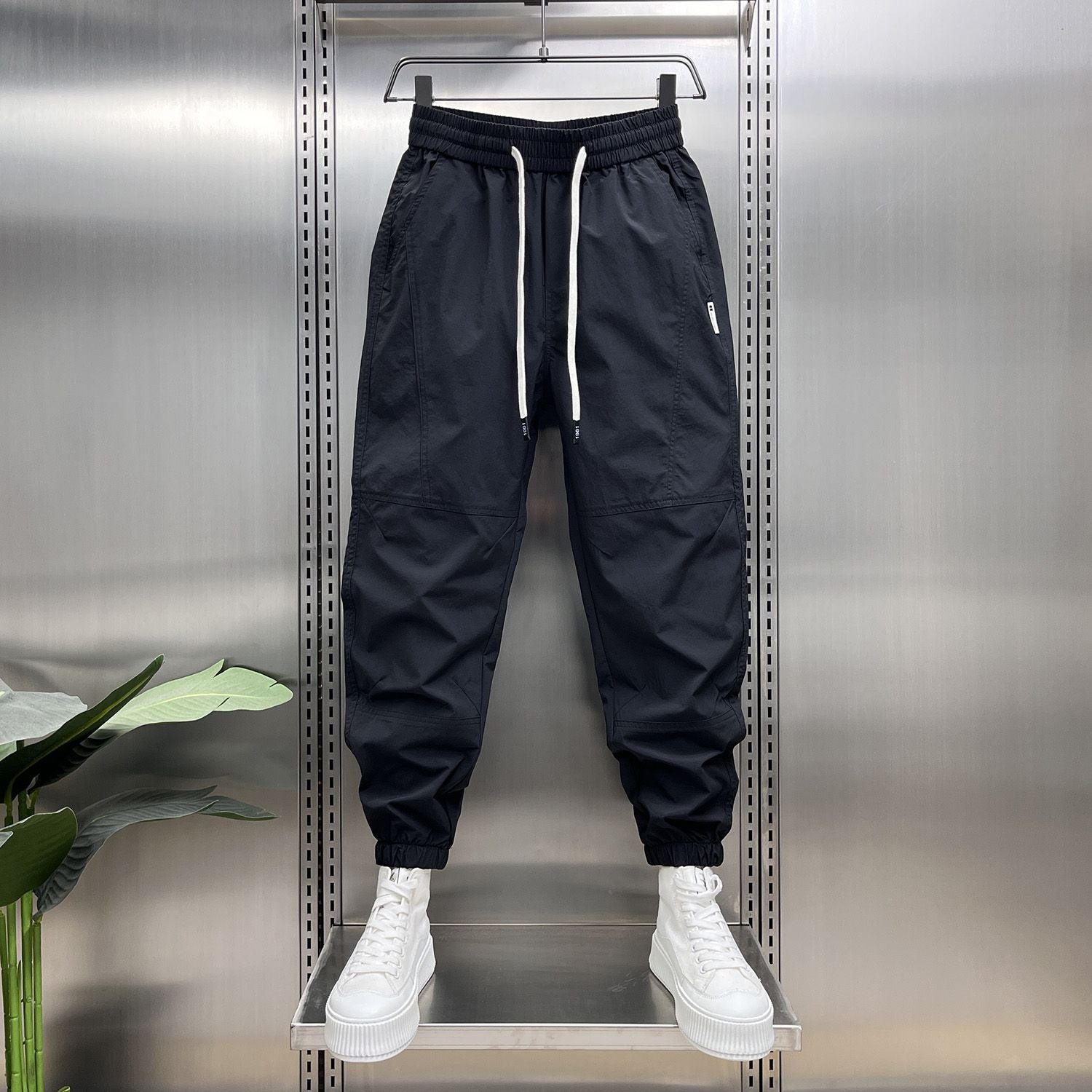 Tin pants feature a contemporary, minimalist design perfect for those seeking a sophisticated style with a modern twist. Made from a dark, smooth fabric, these pants combine a sleek silhouette with sporty details, such as an elastic button belt that offers a comfortable and versatile fit. Side pockets add practicality, while the tapered hem ensures a clean line that pairs perfectly with sneakers or dress shoes.
