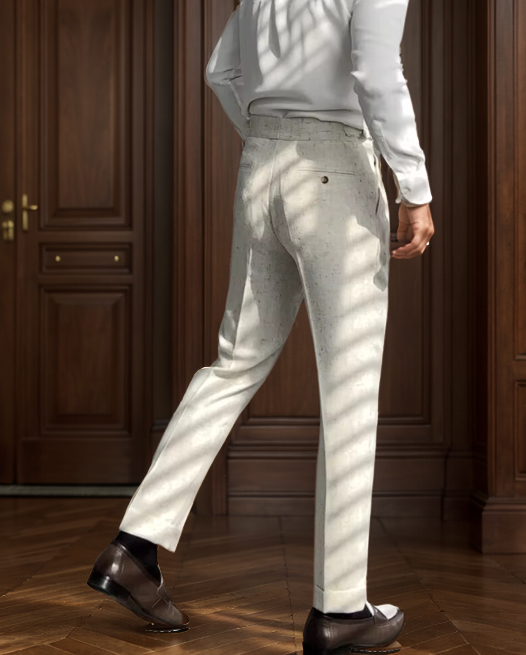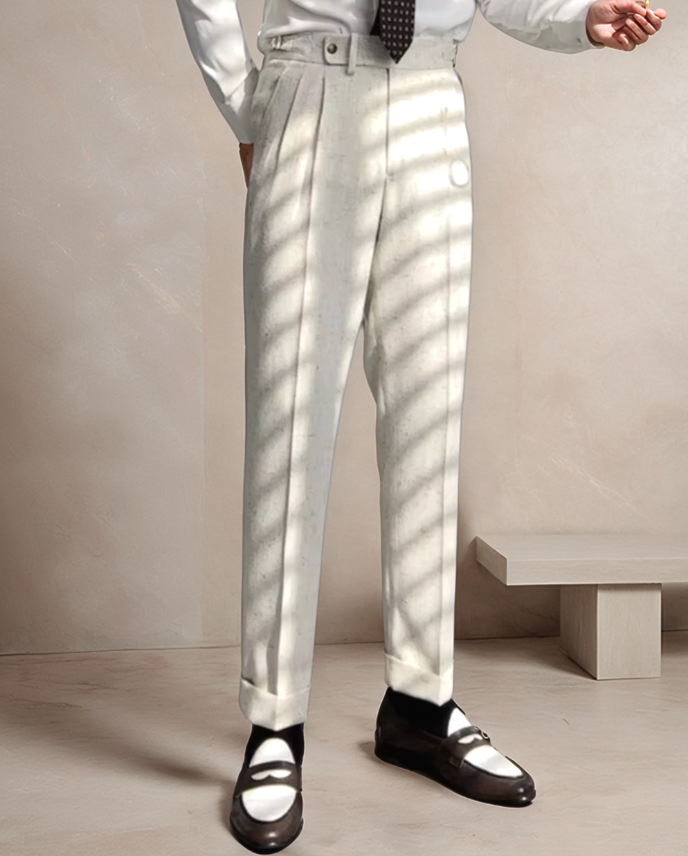 Elevate your wardrobe with these sophisticated off-white high-waisted pleated trousers, designed for the modern gentleman. Featuring a timeless silhouette with double pleats, side adjusters, and a cuffed hem, they blend vintage elegance with contemporary tailoring. Made from a breathable, lightweight fabric, these trousers are ideal for warm-weather formalwear or refined casual styling.