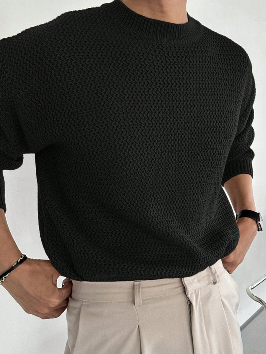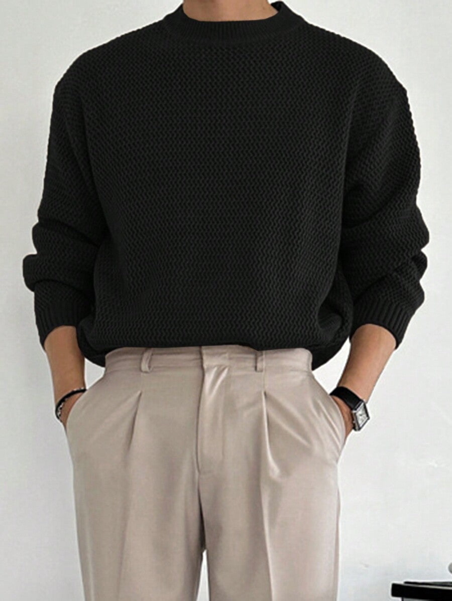 This textured black sweater combines effortless elegance with everyday practicality, making it a staple piece for a modern wardrobe. Its intricate knit pattern adds depth and character while maintaining a sleek aesthetic.
