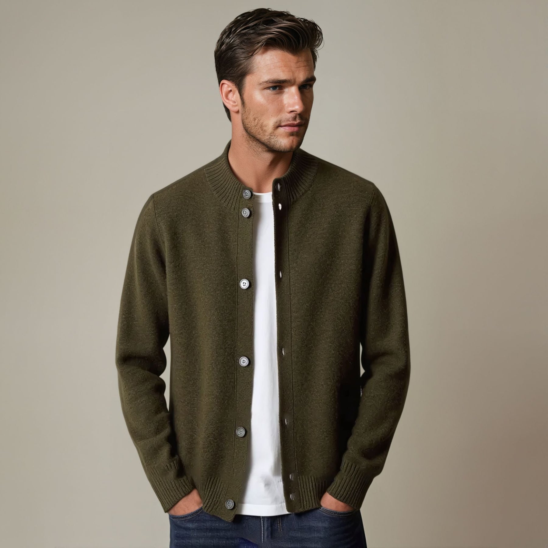 This olive-green cardigan offers a refined blend of sophistication and comfort, making it a wardrobe essential for all seasons. Its button-up design and ribbed detailing enhance the classic aesthetic while maintaining versatility for layering. Perfect for both casual and semi-formal occasions, it pairs seamlessly with a variety of outfits to exude effortless style.