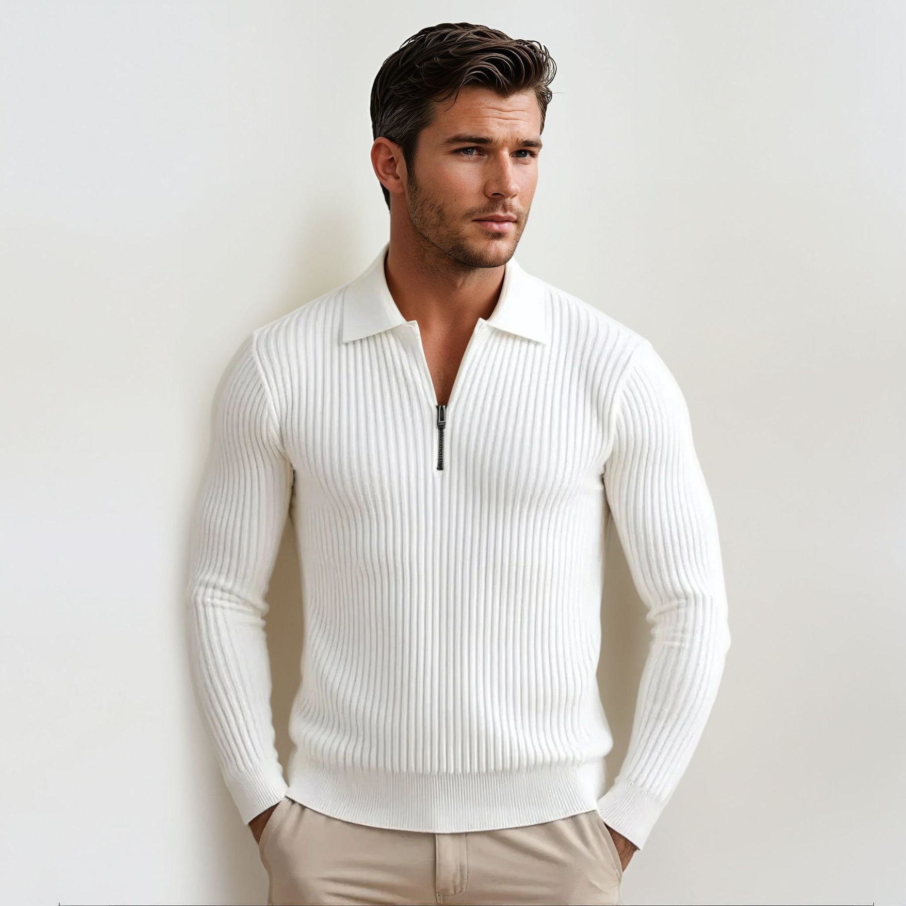 This sharp and refined white ribbed zip-up sweater brings timeless elegance to your wardrobe. With its polished look and comfortable fit, it's a go-to piece for both casual and elevated ensembles.